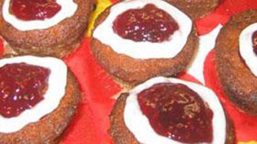 Vatkaa munat ja sokeri vaahdoksi. Lisää vaahtoon kuivat aineet (mausteet kannattaa sekoittaa ensin jauhoihin). Lisää sula rasva ja kermaviili ja sekoita tasaiseksi. Jaa taikina voideltuihin ja korppujauhotettuihin folio- tai muffinivuokiin. Voit käyttää myös torttumuotteja, silikonivuokia tai muffinipeltiä. Paina teelusikalla jokaisen tortun keskelle pieni nokare paistonkestävää marmeladia/hilloa.