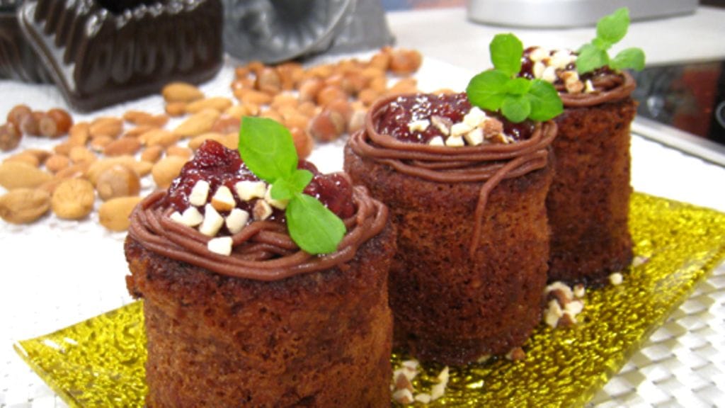Vatkaa munat ja sokeri kuohkeaksi vaahdoksi. Sekoita vehnäjauhot, kaakaojauhe, mantelirouhe, leivinjauhe ja sitruunankuoriraaste.