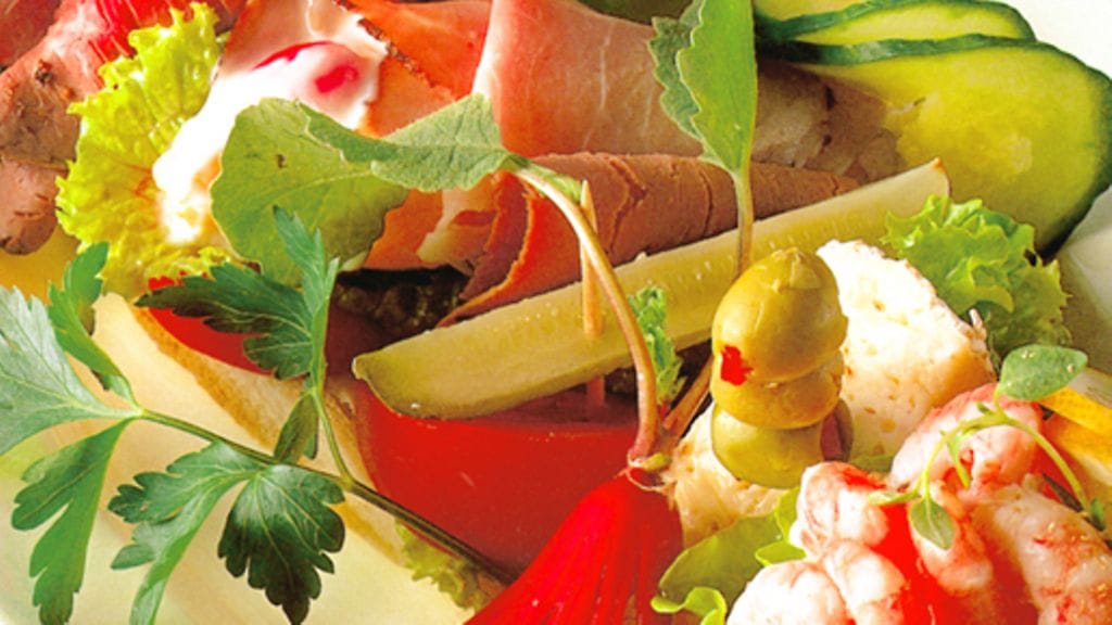 3. Seuraavaksi pane leivälle maksapasteija kurkulla ja tomaatilla koristeltuna. Tarvittaessa voit kiinnittää myös ne hammastikulla. Rullaa italiansalaatti kinkkusiivujen sisään ja pane leivälle. Viimeisenä pane leivälle pikkelssillä koristeltu paahtopaisti. Viimeistele koristelu kurkulla ja persiljalla.