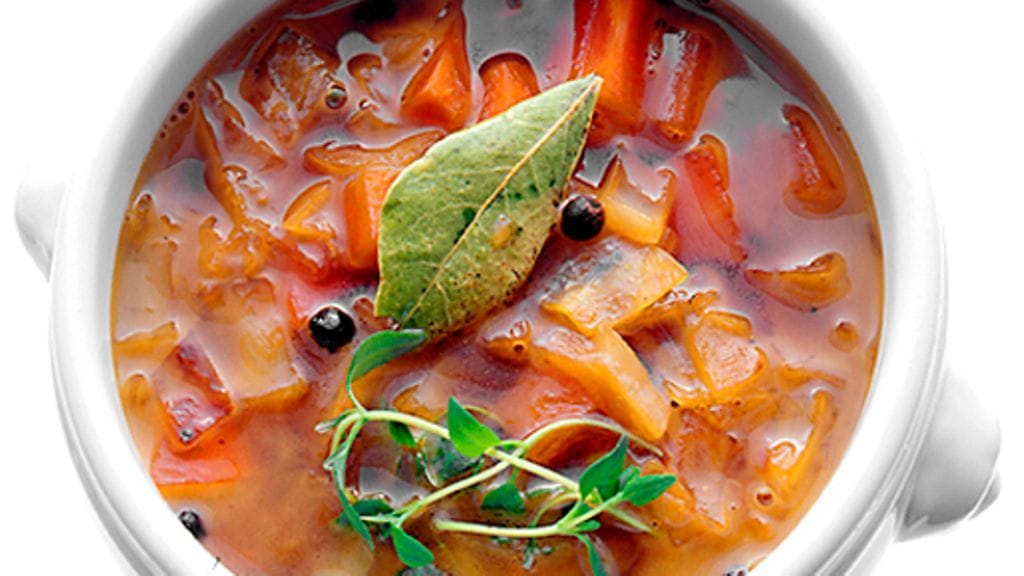 2. Siirrä kaikki tilavaan kattilaan. Kaada päälle vihannesliemi ja lisää sokeri, kumina ja laakerinlehti. Anna keiton kiehua hiljalleen vähintään 40 minuuttia.