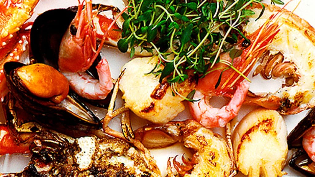 3. Halkaise meriravut pitkittäin ja poista maha ja suoli. Kuori katkaravut, mutta jätä pyrstön lopputupsu paikoilleen. Penslaa kuuma paistinpannu pienellä öljytilkalla ja paahda kampasimpukoita, merirapuja ja katkarapuja muutama minuutti, kunnes meriravut ja kampasimpukat muuttuvat valkoisiksi. Tarjoile paahdetut äyriäiset sekä keitetyt sinisimpukat yhdessä kuuman keiton kanssa. Tarjoa aioli erikseen.