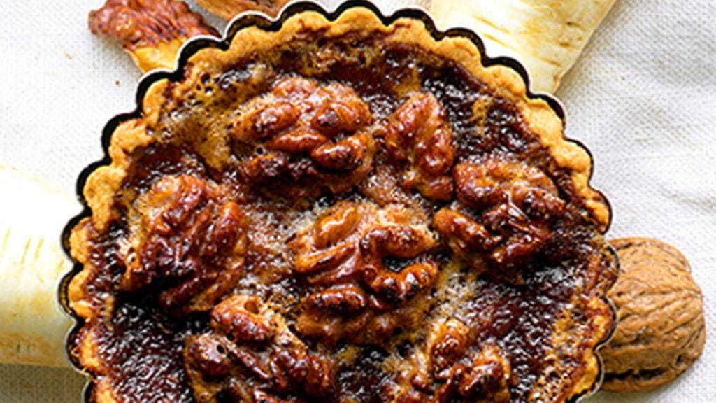 2. Kuumenna uuni 225 asteeseen. Kuori ja viipaloi palsternakat pituussuuntaan, keitä ne lähes pehmeiksi kevyesti suolatussa vedessä. Nosta vedestä ja laita piirakkakuoriin. Suolaa ja levitä päälle herkkusienikreemiä. Kaada päälle kermaa, kruunaa pähkinöillä.