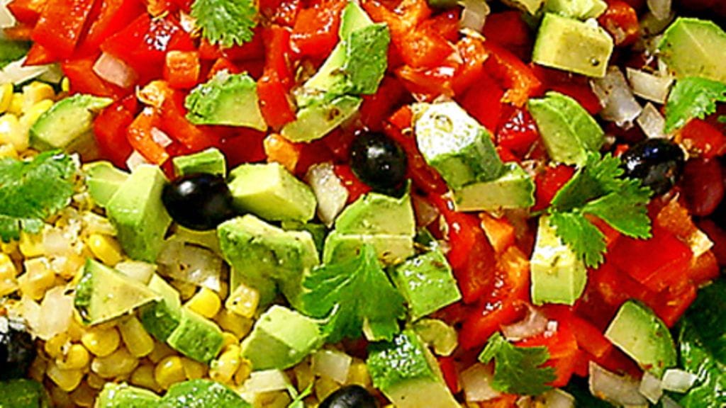 1. Kaada pavut lävikköön ja huuhdo ne kylmällä vedellä. Huuhdo salaatti ja revi pienemmiksi paloiksi. Levitä salaatti vadille. Huuhdo ja suikaloi paprika. Kuori ja hienonna tai suikaloi sipuli ohuesti. Laita pavut, paprika, maissit ja sipuli salaatinlehtien päälle. Asettele mukaan muutama oliivi sekä hieman korianteria. Peitä muovikelmulla ja säilytä kylmässä tarjoiluun asti.