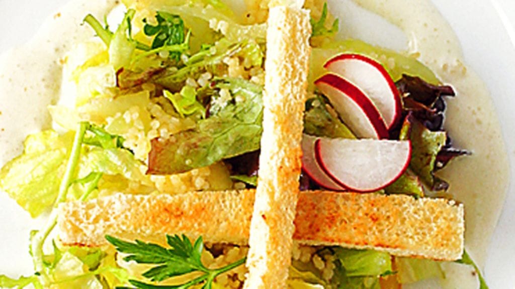 3. Kaada kastike huuhdellun, ravistellun ja revityn salaatin sekä viipaloitujen retiisien päälle. Ripottele päälle kourallinen parmesaaniraastetta tai -lastuja. Tarjoile quinoan ja leipätankojen kera.