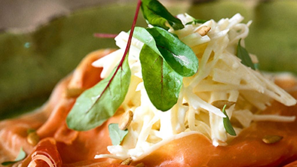 Tämä kevyt salaatti sopii loistavasti alkuruoaksi. Parmankinkun voi vaihtaa muuhun ilmakuivattuun kinkkuun.
