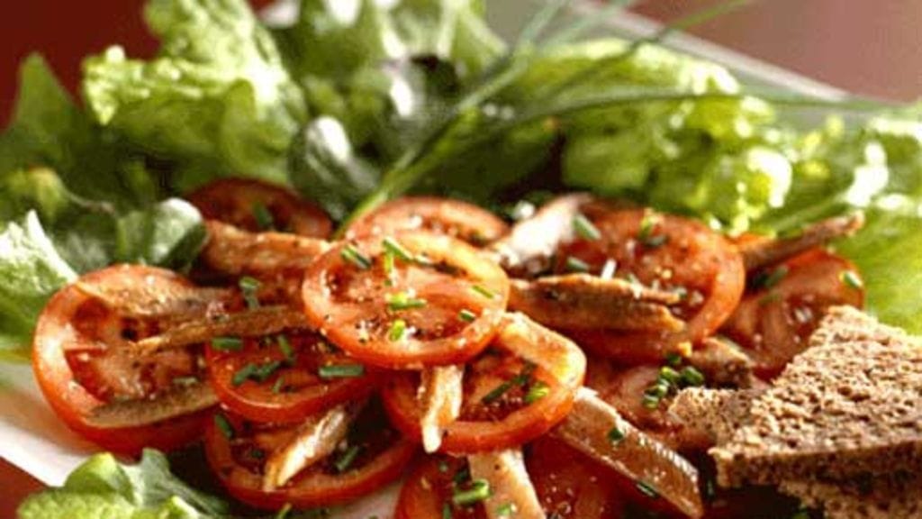 Lado tarjoiluvadille salaattipedin päälle kerroksittain kalapaloja, tomaattiviipaleita ja hienonnettua ruohosipulia.