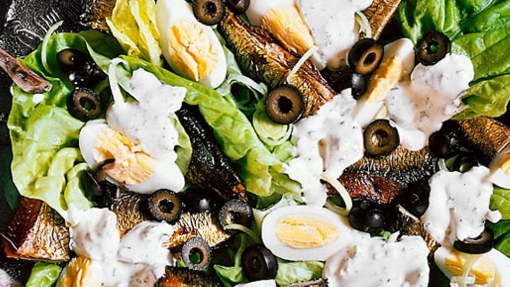 1. Huuhdo salaatinlehdet ja valuta. Perkaa kaloista nahka ja ruodot ja murra kala pienemmiksi paloiksi. Asettele kalat, salaatti, munanlohkot ja oliivit vadille.