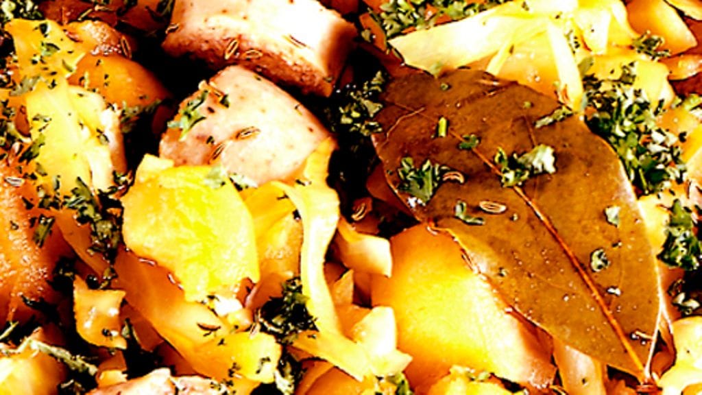 1. Kuori ja viipaloi perunat. Suikaloi kaali ja lado vuorotellen perunoiden kanssa pataan. Mausta kerrosten välillä ja lisää laakerinlehti pataan.