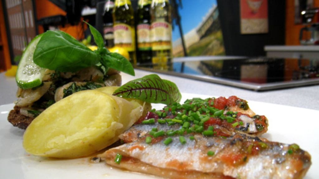Kuumenna öljy laakeassa kattilassa tai pannulla. Kuullota siinä sipulit ja valkosipuli ja isää muut aineet ja kiehauta. Kaada kastike kalojen päälle. Kypsennä 220 asteisessa uunissa noin 5-8 minuuttia. Tarjoa hieman jäähtyneenä maalaishiivaleivän kera.