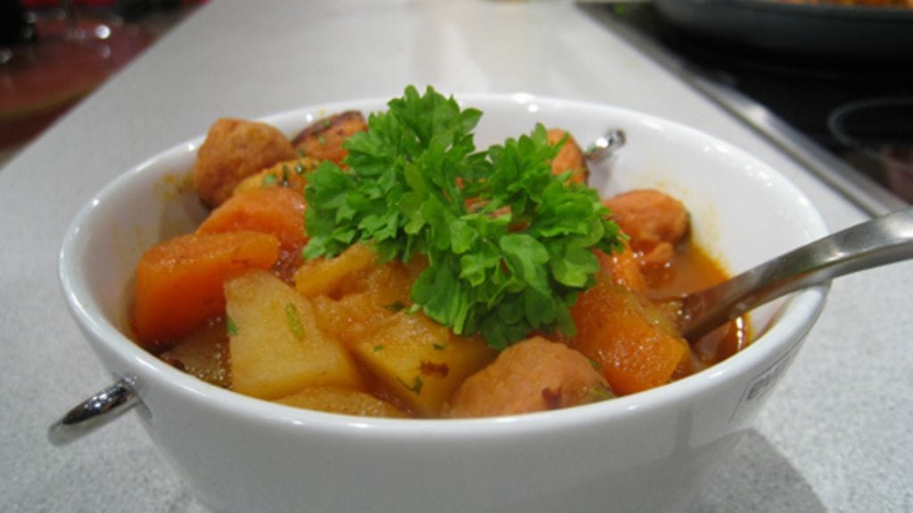 Lisää vettä ja anna padan hautua kannen alla parisenkymmentä minuuttia. Tarkista padan suolaisuus ja leikkaa lopuksi reilusti persiljaa padan joukkoon.