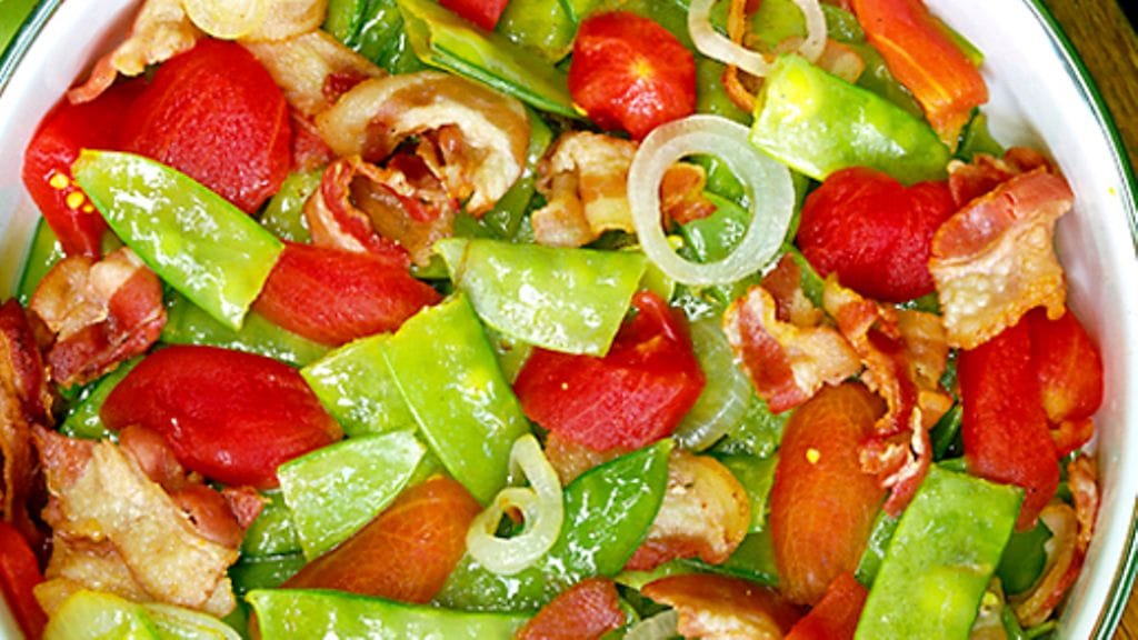 2. Leikkaa tomaatit isoiksi lohkoiksi ja lisää ne pannulle. Keitä hiljaa kannen alla 10 minuuttia, kunnes herneenpalot pehmenevät. Kääntele pekonit joukkoon ja kuumenna.