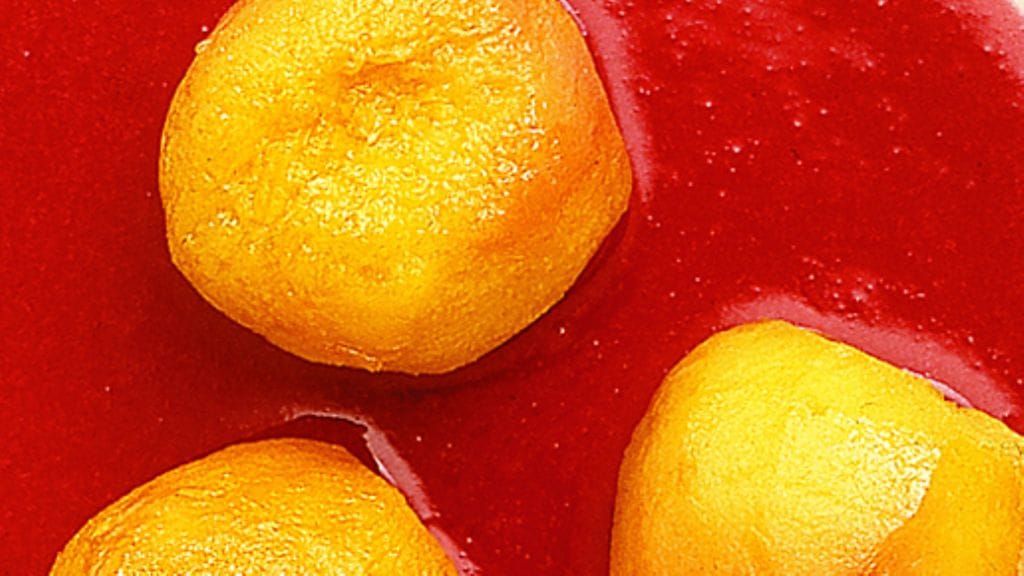 2. Pane persikat sokeriliemeen ja keitä niitä, kunnes ne ovat pehmenneet, koosta riippuen 10-20 minuuttia. Liemen tulisi peittää hedelmät. Lisää tarvittaessa vettä ja sokeria, kuitenkin suhteessa 4:1. Anna sitten persikoiden jäähtyä liemessä.