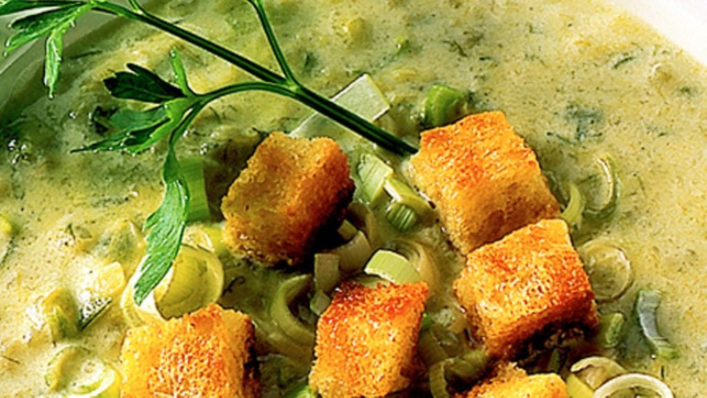 3. Leikkaa leipäviipaleista reunat pois ja kuutioi ne. Paista kuutiot kullanruskeiksi voissa. Tarjoile keitto lämmitetyiltä keittolautasilta, ripottele päälle leipäkuutioita.