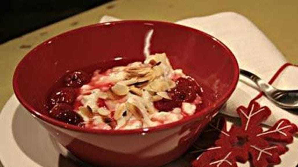 Vatkaa kerma vaahdoksi vaniljasokerin kanssa. Sekoita se kylmään riisipuuroon. Lisää joukkoon hieman kanelia, paahdetut mantelilastut ja kokonainen manteli. Laita tarjoilukulhoon ja jääkaappiin odottamaan tarjoilua. Tarjoile lämpimän kirsikkakeiton kanssa.