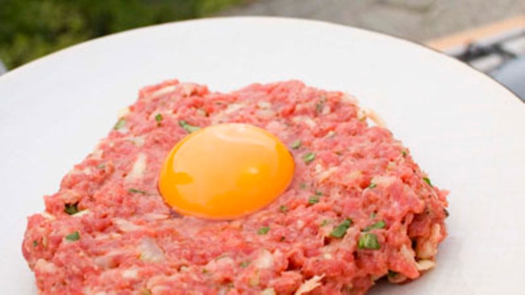 Siirrä tarjoilulautaselle ja aseta pihvin päälle kananmunan keltuainen. Tarjoa heti.
