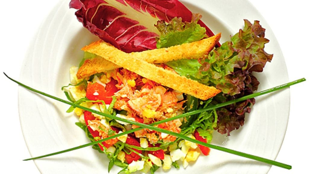 3. Puhdista taskuravunlihat. Kuutioi paprikat, retiisit ja kurkku pieniksi paloiksi. Viipaloi munat ja kuutioi viipaleet. Sekoita taskuravunliha, paprika, kurkku ja muna. Kääntele mukaan kastike. Huuhdo jäävuorisalaatti ja suikaloi hienoksi. Laita salaatinlehdet neljälle lautaselle, niiden päälle jäävuorisalaattia ja levitä rapuseos päälle. Koristele krutongein ja asettele päälle ruohosipulia.