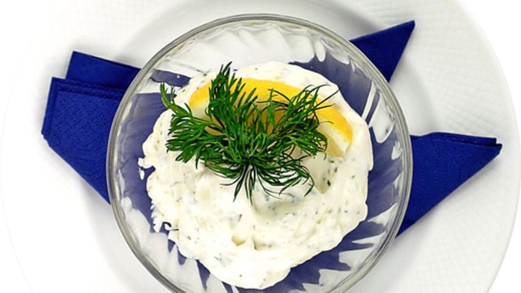 1. Sekoita majoneesi ja kermaviili. Lisää tilli. Mausta sitruunalla, suolalla ja pippurilla. Anna vetäytyä kylmässä ennen tarjoilua.