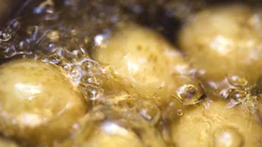 Kuori ja viipaloi perunat. Silppua sipuli hienoksi ja sekoita perunaviipaleiden kanssa. Paista seosta reilussa öljyssä miedolla lämmöllä ja poista reikäkauhalla, kun perunat ovat kypsiä. Anna kuivahtaa talouspaperin päällä.