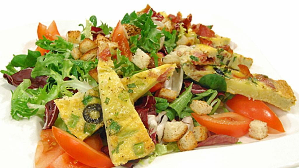 Leikkaa tomaatit 8 osaan, sekoita salaatin kanssa ja nostele tarjoiluastiaan. Leikkaa munakas paloiksi ja nostele salaatin reunoille.