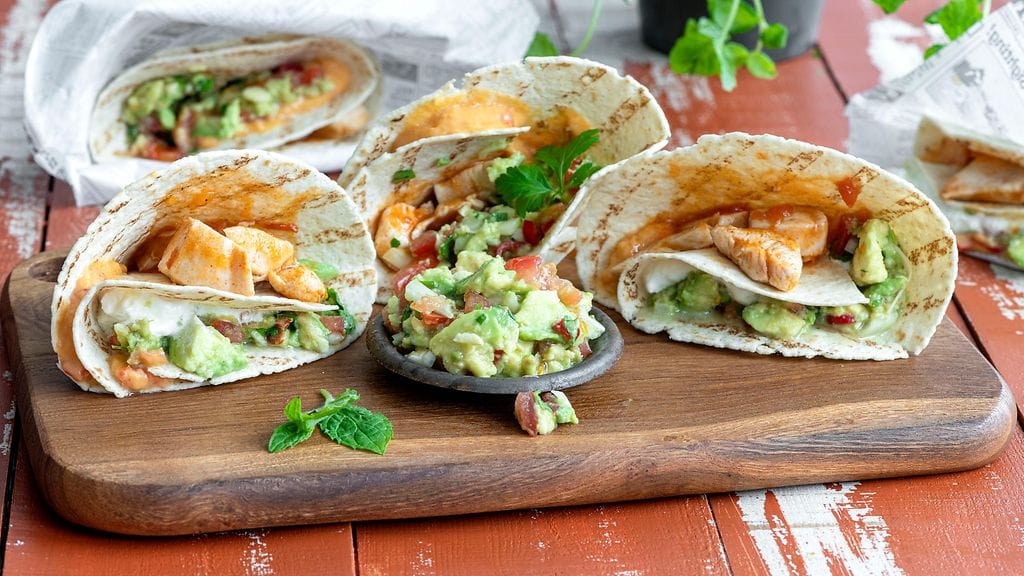 - Leikkaa broilerinfileet suikaleiksi. Kuori ja hienonna valkosipulinkynnet. Kuumenna rypsi- tai oliiviöljy. Paista broilerinfileesuikaleet kauttaaltaan ja mausta tacomausteella. Lisää joukkoon salsakastike ja kuumenna.