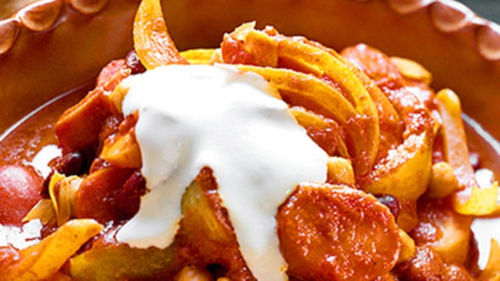 3. Lisää pekoni, sipuli ja makkara tomaattikattilaan. Lisää chili, chilijauhe, juustokumina ja mustapippuri. Kääntele viimeiseksi mukaan kikherneet ja anna niiden kiehua padan kanssa hetki.