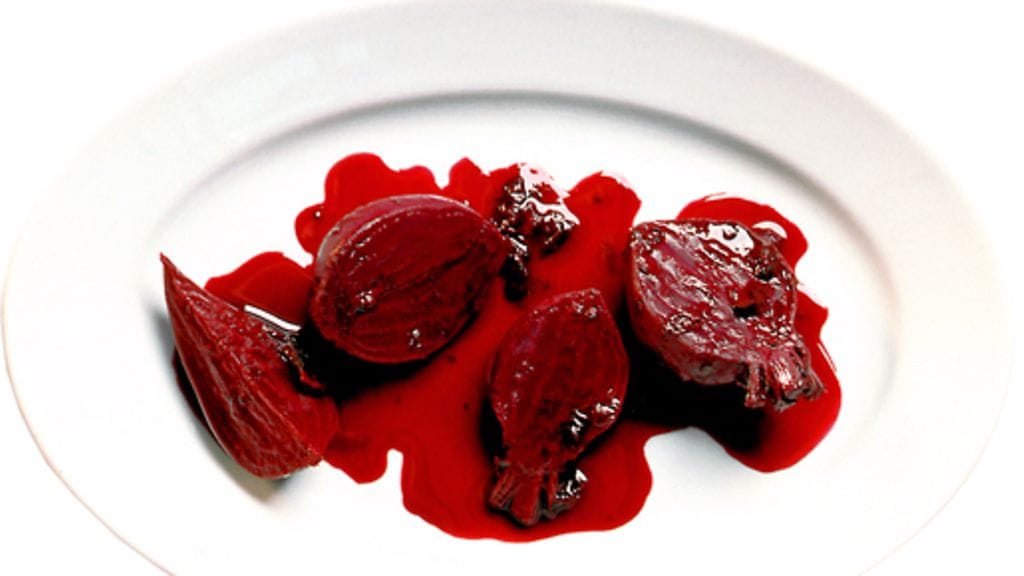 3. Laita siivilöidyt viinimarjat pataan, lisää 1 dl keitinlientä ja voi. Kuumenna ja mausta suolalla, pippurilla ja sitruunamehulla. Lisää punajuuret pataan ja anna kiehua lyhyt hetki. Tarjoile lämpimiltä lautasilta.