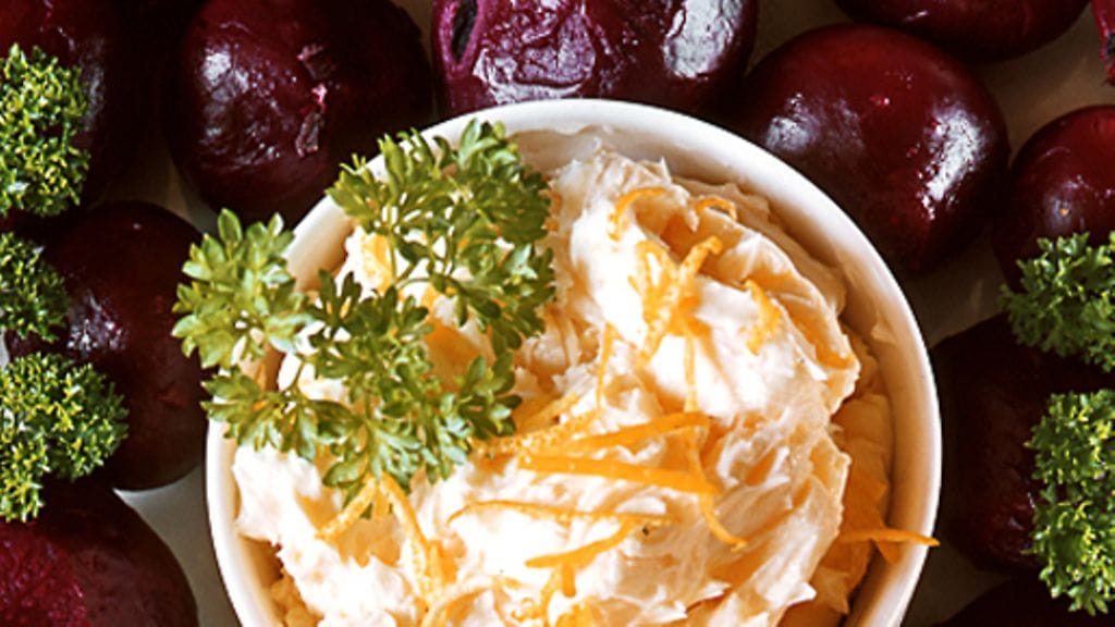 3. Sekoita voi pehmeäksi, mausta tilkalla sitruunamehua ja raastettua kuorta. Ripottele päälle hiutalesuolaa ja tarjoile punajuurten kera.