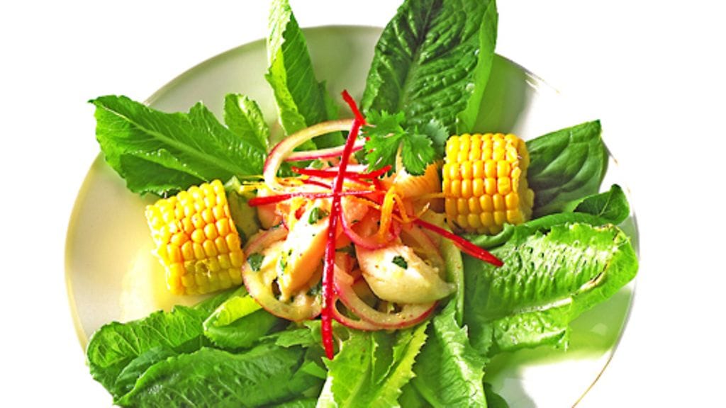 3. Keitä maissintähkiä ripauksella suolaa maustetussa vedessä 20 minuuttia. Paloittele tähkät. Halkaise, huuhtele ja suikaloi chilipalot. Asettele salaatinlehdet kauniisti lautasille ja jaa kalapalat salaatinlehtien päälle. Leikkaa toinen sipuli renkaiksi. Koristele ceviche sipulirenkailla, chilisuikaleilla ja keitetyllä maissilla.