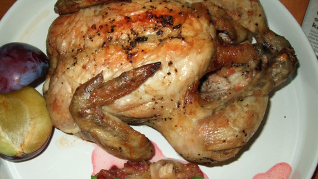 Hiero broilerin sisään suolaa ja mustapippuria ja täytä broileri luumutäytteellä. Sido broilerin koivet ja siivet. Leikkaa koipiin veitsellä muutama viilto. Hiero broilerin pintaan suolaa, mustapippuria ja loput oliiviöljystä.