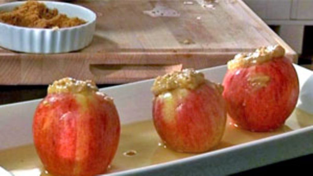 Poista kokonaisesta omenasta siemenkota esimerkiksi omenaporalla. Vatkaa keltuaiset ja sokeri vaahdoksi, sekoita joukkoon voi ja keksin murut. Asettele omenat uunivuokaan ja täytä seoksella. Sekoita likööri ja viini, kostuta omenat ja kaada loput vuoan pohjalle. Paista 200 asteessa n. 30 minuuttia. Tarjoile välittömästi vaniljajäätelön kanssa.