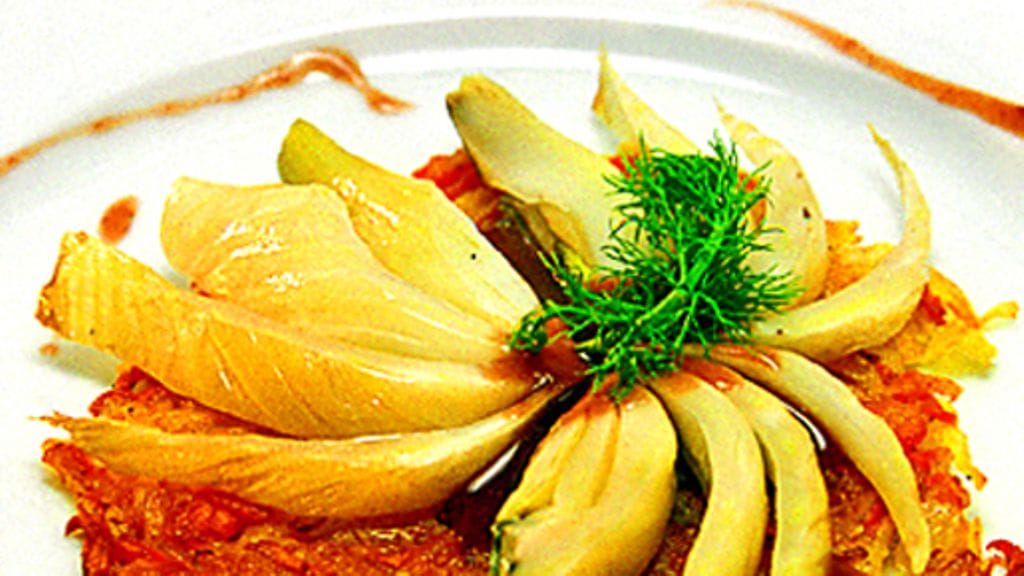 3. Asettele röstit neljälle lämpimälle lautaselle ja fenkolit röstien päälle.