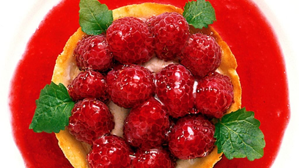 3. Tipauta 1 rkl ranskankermaa jokaiseen tartelettiin ja jaa loput vadelmat kermapedille. Siivilöi päälle tomusokeria. Lusikoi vadelmakasktiketta peiliksi annoslautasille ja asettele täytetyt tarteletit niiden päälle. Koristele sitruunamelissalla tai tuoreella mintulla ja tarjoile heti.