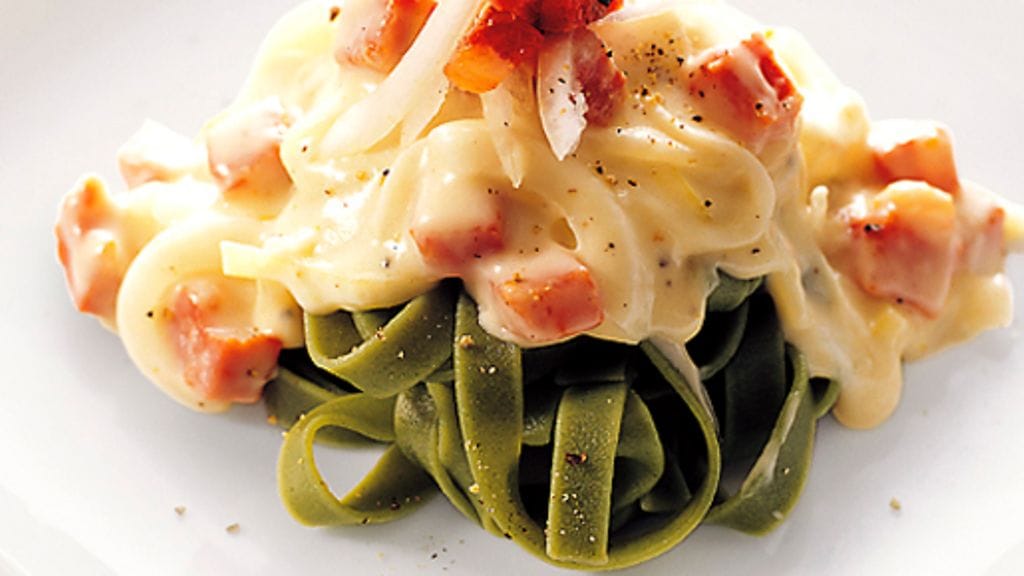 2. Kuullota sipuli ja salami oliiviöljyssä. Lisää maito ja kiehauta. Sekoita jauhot ja voi keskenään, lisää seos kiehuvaan kastikkeeseen ja anna kiehua vielä viisi minuuttia. Mausta suolalla ja pippurilla. Purista joukkoon valkosipuli.