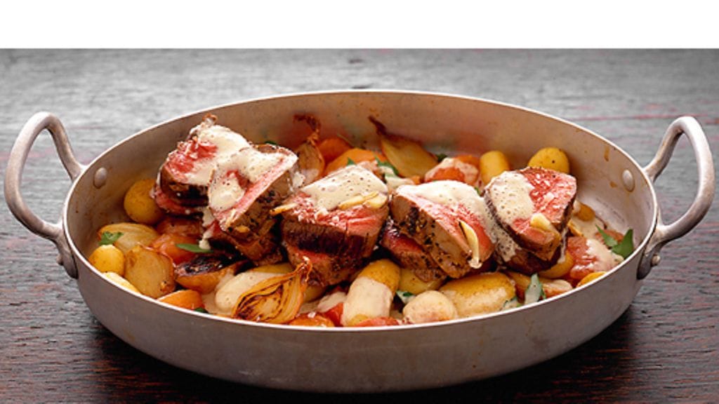 3. Kuori ja puolita valkosipulinkynnet. Puhdista filee, paina siihen syviä viiltoja veitsellä ja työnnä viiltoihin valkosipulia. Hiero fileen pintaan suolaa ja pippuria ja ruskista voissa ympäriinsä. Siirrä uunivuokaan. Paista uunin keskitasolla n. 20 minuuttia, kunnes fileen sisälämpötila on 61-63 astetta (rosa) tai 70 astetta (medium). Anna lihan vetäytyä 10 minuuttia ennen viipalointia. Laita tomaatit ja persiljasilppu perunapedille ja nostele fileeviipaleet niiden päälle. Valuta kaiken ylle voikastiketta.