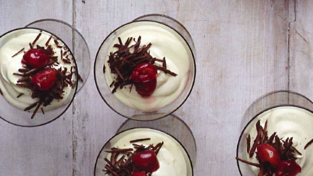 6. Valuta kirsikat ja laita niistä kahdeksan sivuun koristelua varten. Jaa loput kirsikat yksittäisiin annoskulhoihin ja pursota tai lusikoi valkosuklaavaahto kirsikoiden päälle. Laita kunkin annoksen päälle pari kirsikkaa, raasta päälle hieman tummaa suklaata ja tarjoa.