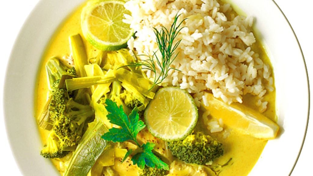 3. Kaada currykastike toiseen kattilaan ja kuumenna. Lisää kala, purjo ja parsakaali. Koristele limellä ja sitruunalla, tarjoile keitetyn riisin kera.