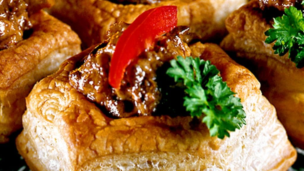 3. Paista pasteijat kypsiksi pakkauksen ohjeen mukaan. Täytä ne maksahöystöllä, koristele ja tarjoile heti.
