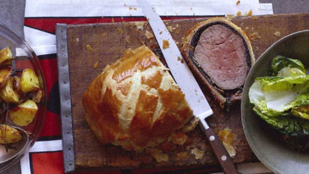 3. Laita työalustalle kelmua ja järjestä parmankinkkuviipaleet kelmun päälle hieman limittäisiin riveihin. Levitä palettiveitsellä sienitahna kinkun päälle ja aseta pinnalta paistettu häränfilee keskelle. Ota kelmun reunasta kiinni ja kääri parmankinkku ja sienet tiiviisti ja siististi rullalle häränfileen ympärille. Kääri kelmun päät kierteelle, niin että paketti pysyy koossa. Jäähdytä jääkaapissa 15–20 minuuttia, jotta filee tekeytyy ja sen muoto kiinteytyy.