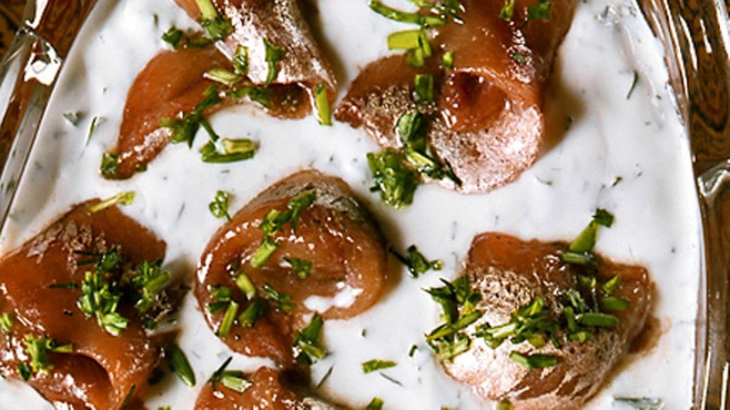 1. Sekoita kermaviili huolellisesti hienonnettujen yrttien kanssa, kaada kastike pieneen salaattikulhoon. Kääri anjovikset rullalle ja laita ne kastikkeeseen. Koristele hienonnetulla ruohosipulilla.