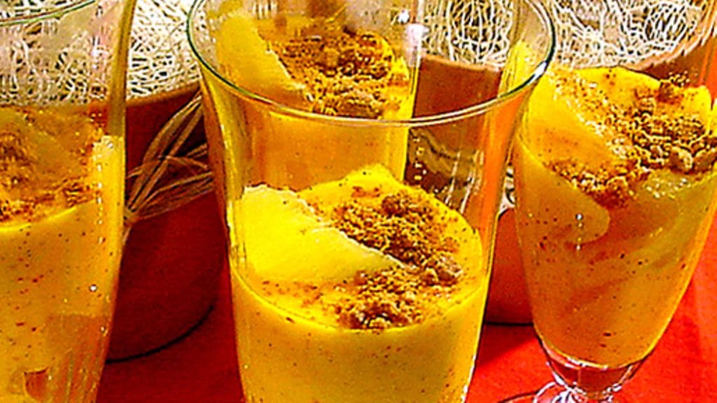 3. Leikkaa appelsiinin päistä noin 2 cm pois. Kuori se paksusti veitsellä. Leikkaa appelsiinista kalvottomia lohkoja kalvojen välistä. Murusta piparkakut. Koristele munavaahto appelsiinifilein ja piparkakkumurusin.
